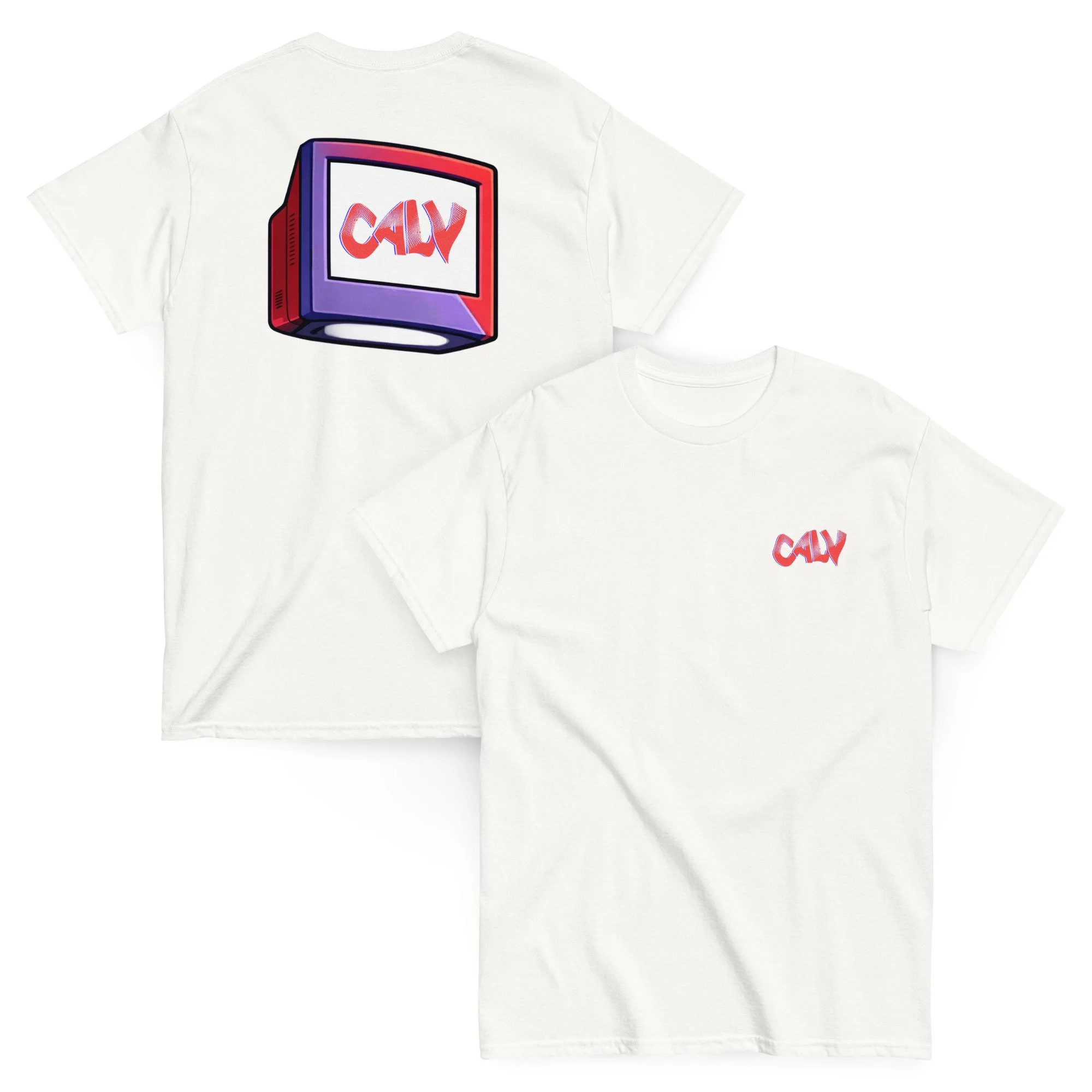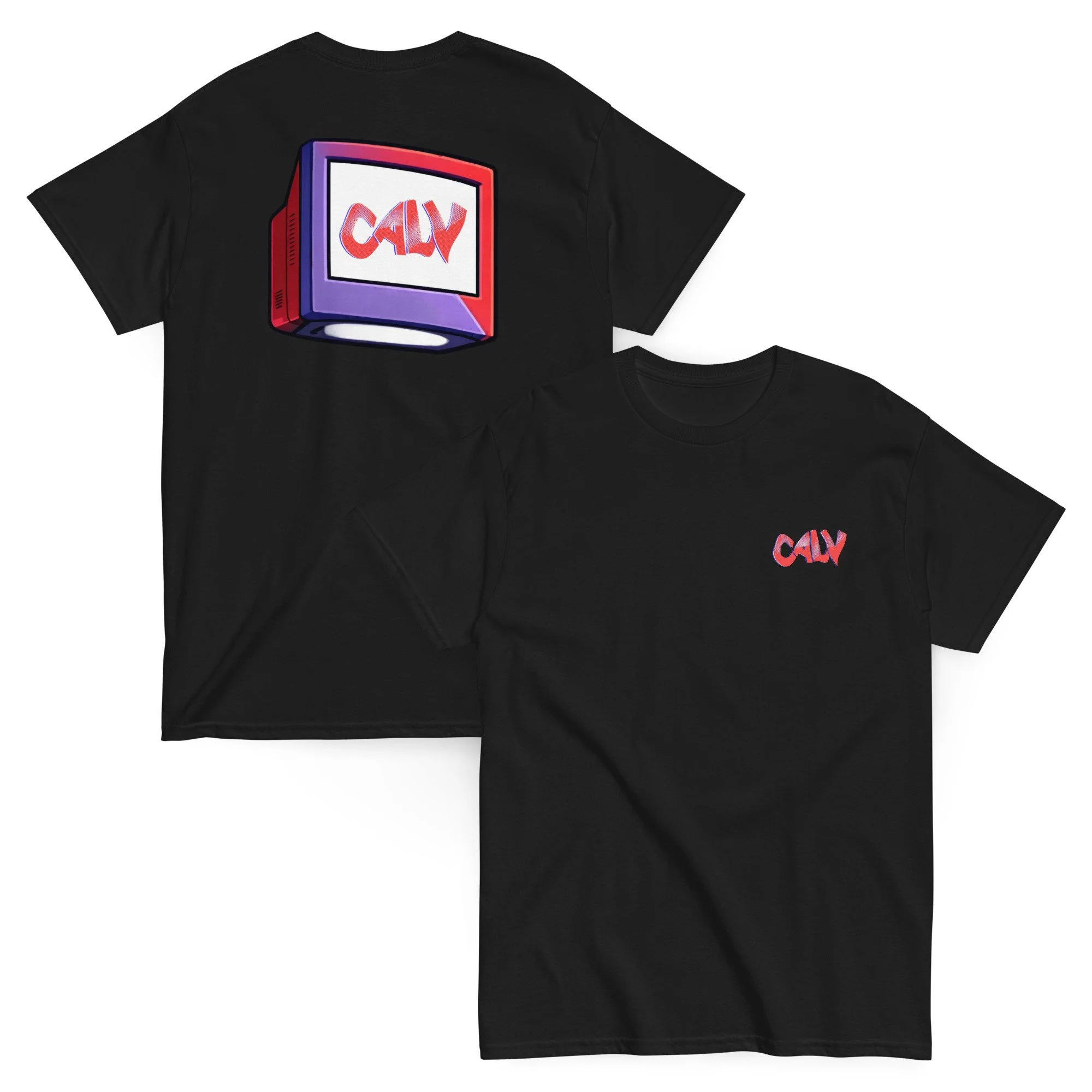 This tee features Calv’s signature look—his iconic headpiece paired with a bold, distorted CALV graphic blasting through the screen.